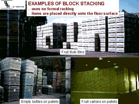 | Block stacking is a storage method which uses no formal racking. The items to be stored are placed directly onto the floor surface of the building. |