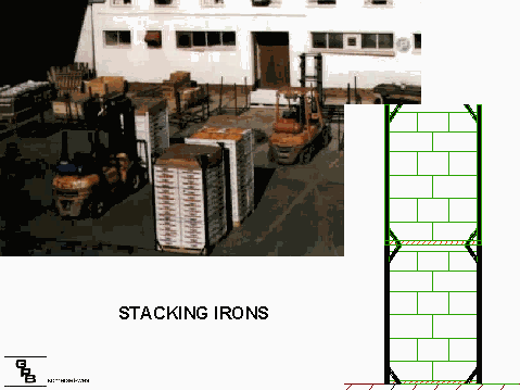 | The major reason for not stacking very high is the stability of the stack and the problem of the bottom item bearing the load of the item on top of it. For a pallet with cartons the pallet on top may cause damage to the cartons below. To work around this problem, different equipment is available. One of these is stacking irons used in the fruit industry. These irons fit around the corners of the pallet like legs and are slightly higher in length than the bottom pallet stacked. The next pallet is placed on top of this base which then bears the weight and not the bottom pallet. |