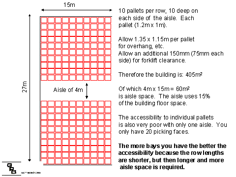 | All this type of equipment however has the disadvantage in that it needs to be assembled which uses manpower as well as time. But on the other hand you do not have the capital expense, permanence and rigid layout of a racking system. It is however not just the height that plays a role in block stacking. The other aspect is accessibility and this is related to the number of aisles in the layout. Aisles take up valuable storage space, but the more aisles, the easier it is to get to the pallet/bulk bin/ etc. A standard forklift truck needs at least a 4m aisle to be able to retrieve a pallet (1,2m x 1m) and turn. If we had a building of 15m x 27m and we stored pallets 10 deep as follows: